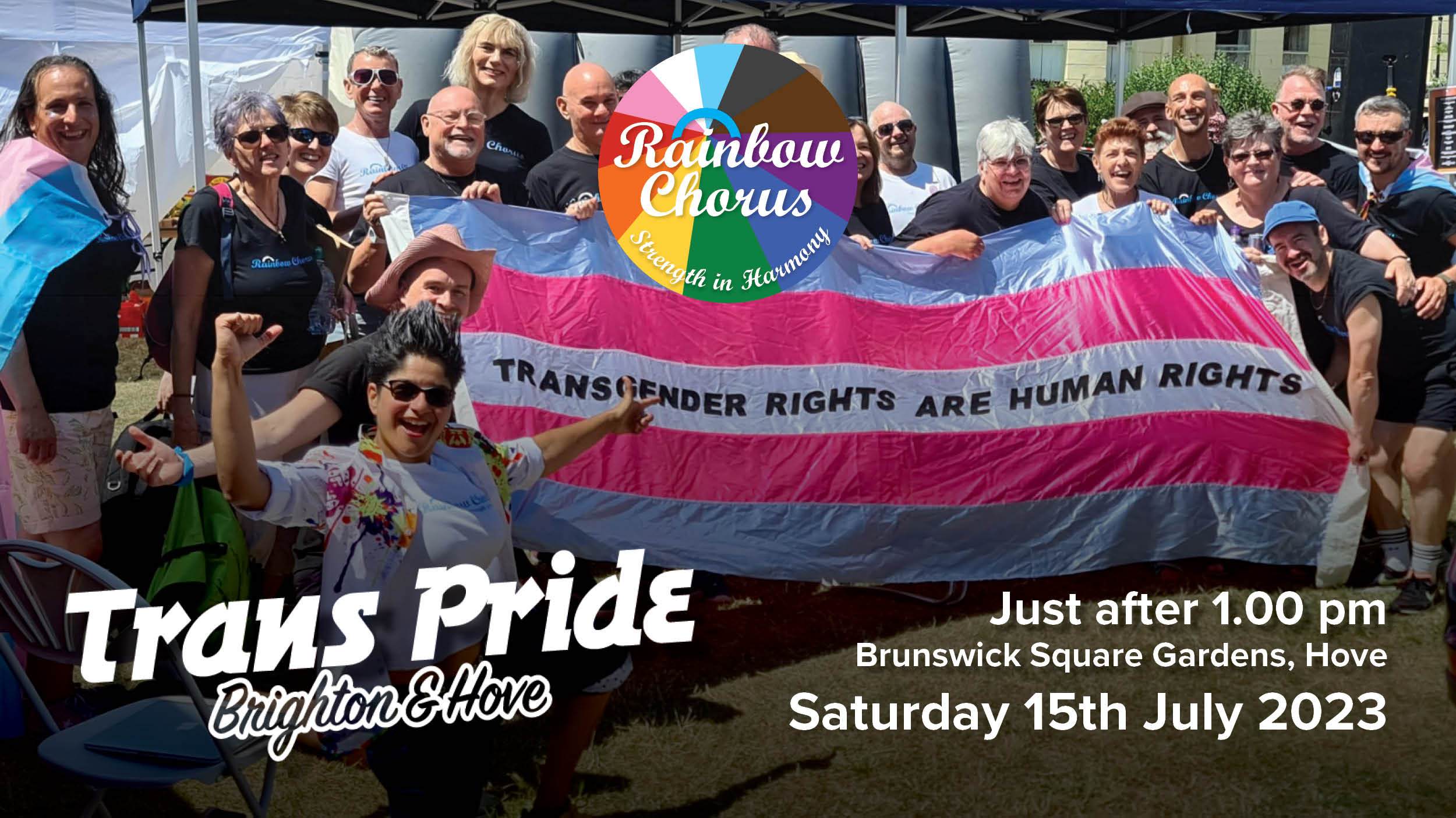 The Rainbow Chorus will open the show at the Brighton And Hove Trans Pride Park Celebration at Brunswick Square Gardens on Saturday 15th July 2023. Come and see us at around 1pm. Let’s have a party!