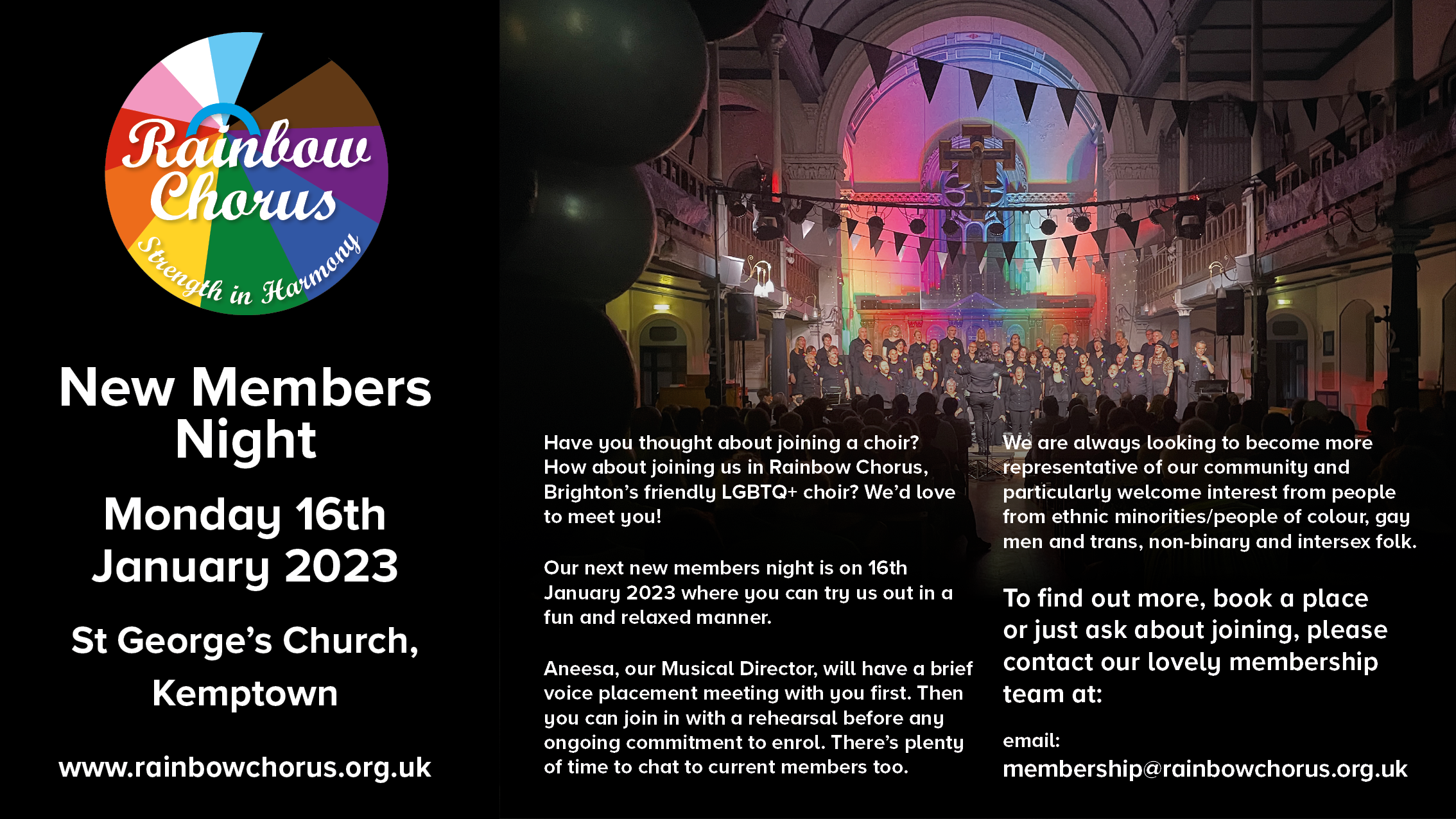 We look forward to seeing you at New Members Night on the 16th January 2023. If you have any questions please get in touch with out membership team – email: membership@rainbowchorus.org.uk
